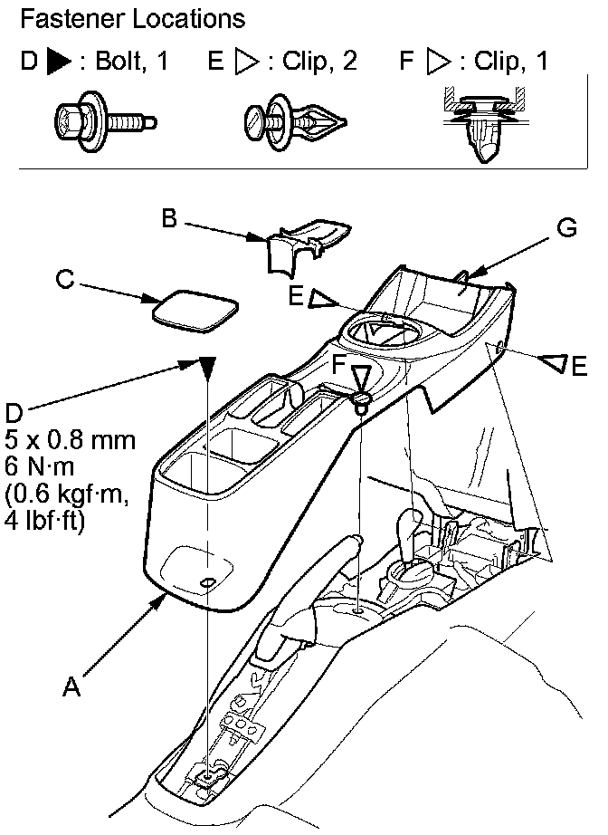 2. Remove the console box mat (C), then remove the bolt (D), and the clips (E).