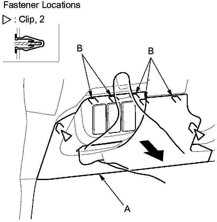 1. Pull the fuse access panel (A) back by hand to release the hooks (B) and the clips.