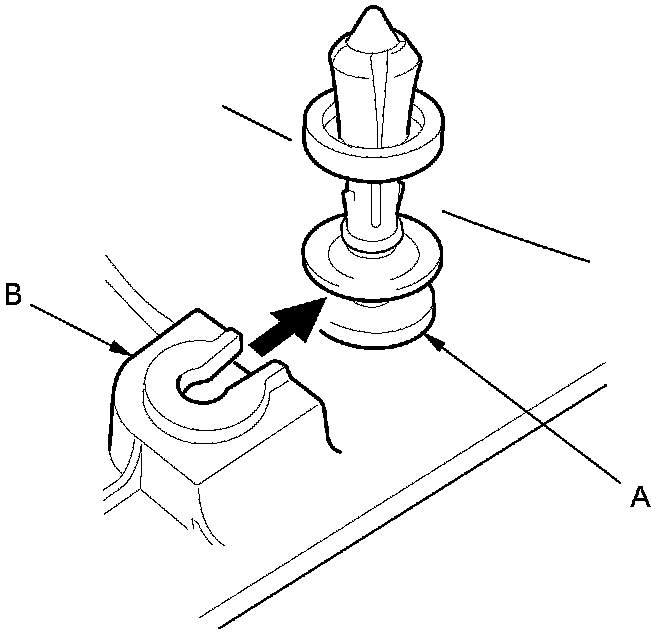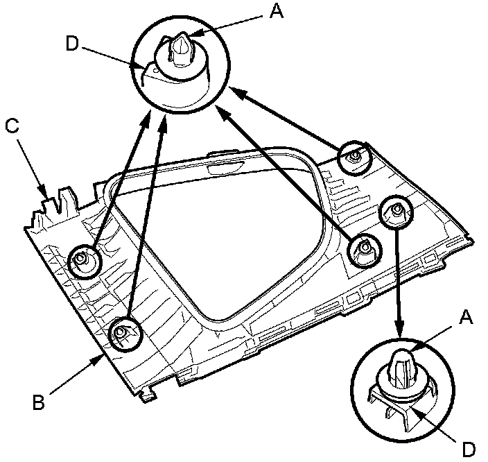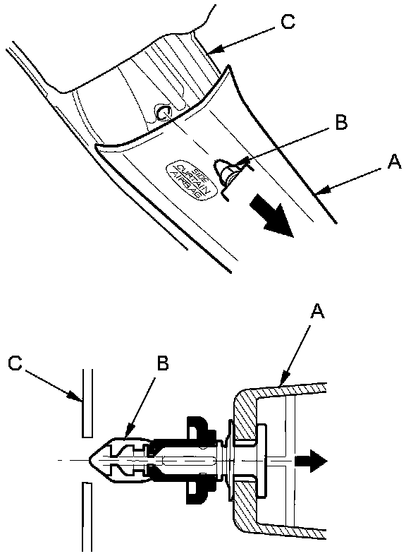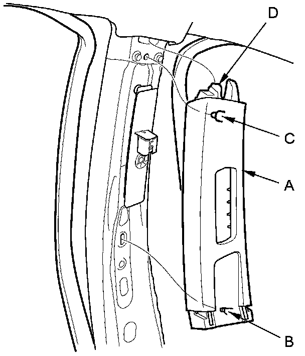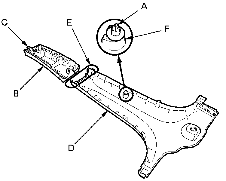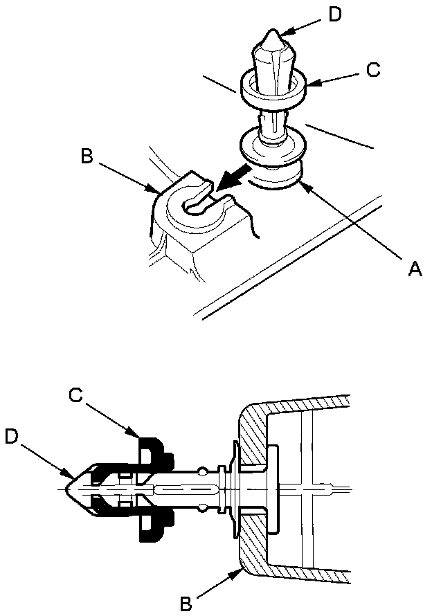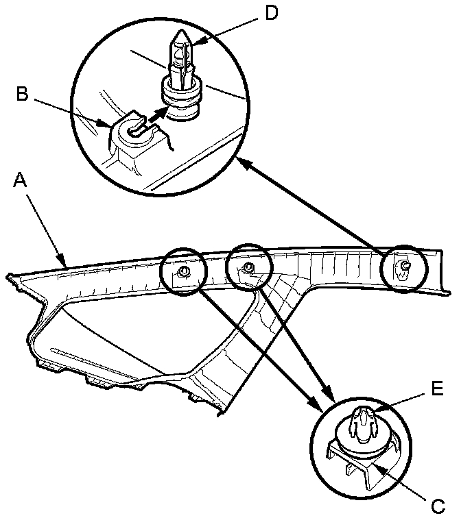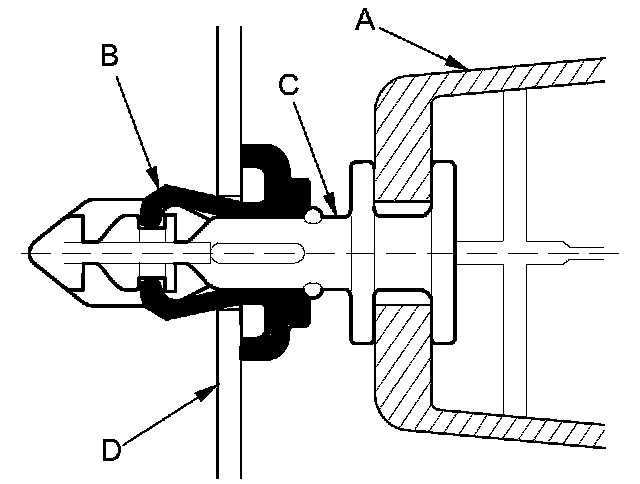 - The upper clip for the A-pillar trim (A) consists of a plastic grommet (B) expanded by a metal pin (C), which secures the grommet to the body (D).