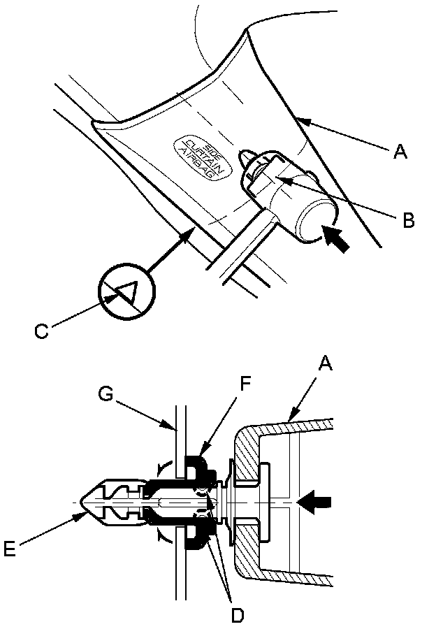2. Hit the upper clip in the A-pillar trim (A) with a rubber mallet. The clip is located under the point (B) where the triangle mark (C) on the edge of the trim indicates. Hitting the clip slides the projections (D) on the pin (E) into the grommet (F). The projections break the grommet, which releases the clip from the body (G).