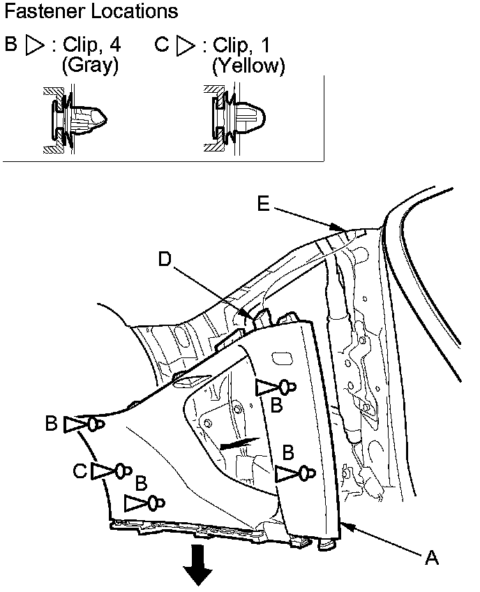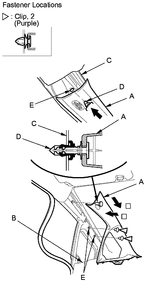 2. Place the trim over the A-pillar (C), and fit its upper clip (D), and the lower clips into the holes (E) in the A-pillar, then lightly push the trim into place.