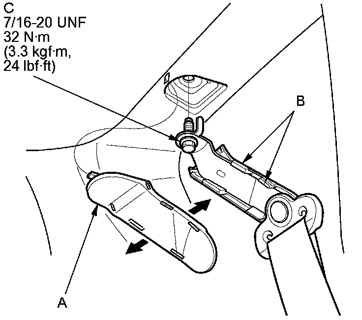 2. Remove the upper anchor cover (A) by releasing the hooks (B), then remove the rear seat belt upper anchor bolt (C).