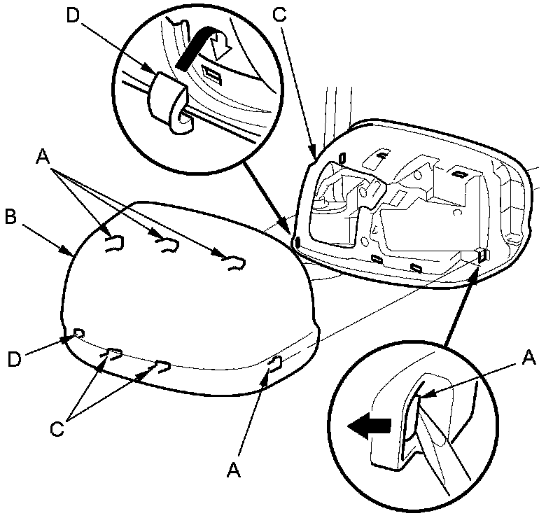3. Release the hooks (C, D), then remove the mirror housing cover.