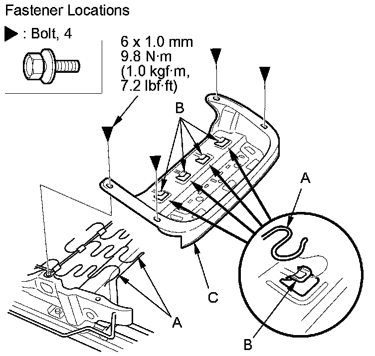 4. If necessary, remove the bolts, and release the seat cushion springs (A) from the hooks (B), then remove the seat cushion frame (C).