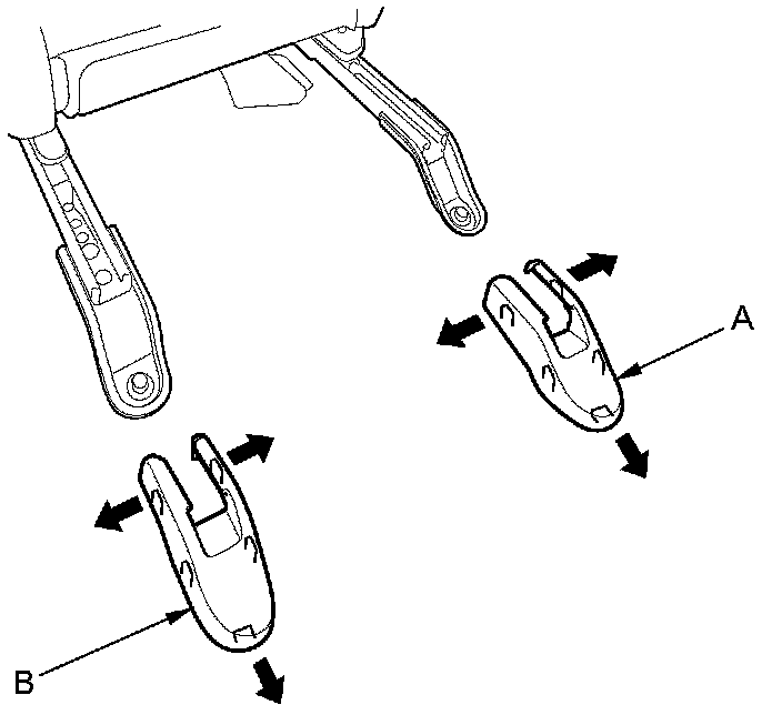 5. Slide the front seat all the way forward, and remove the track end covers (A, B) from the rear of both seat tracks.
