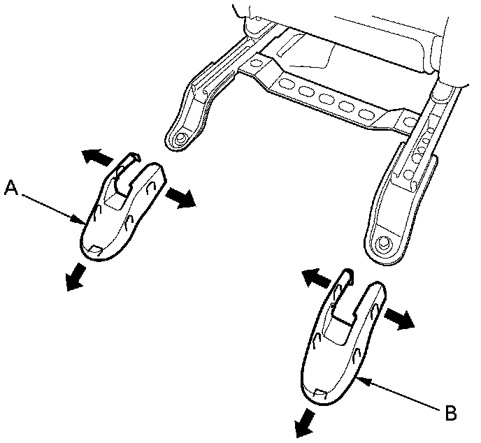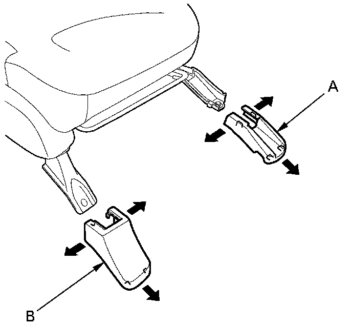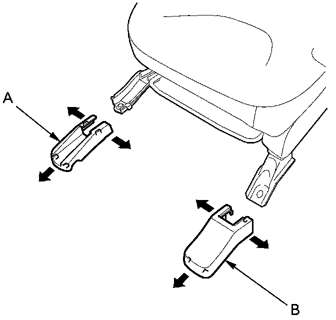 6. Slide the front seat all the way back, and remove the track end covers (A, B) from the front of both seat tracks.