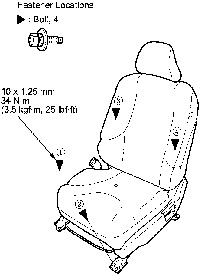 - Tighten the seat mounting bolts to the specified torque in the sequence shown. Slide the seat all the way back and tighten (1) and (2), then slide it forward and tighten (3) and (4). The driver's seat is shown; the passenger's seat is symmetrical.