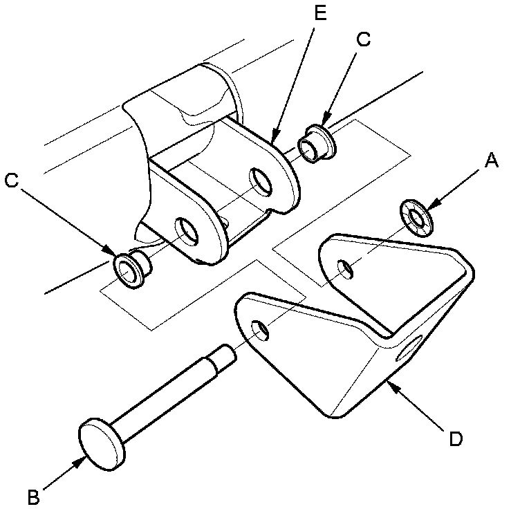 3. Remove the pivot pin, the pivot collars (C), and the hinge (D) from the seat-back frame (E). An inside hinge of a seat-back frame is shown. The outside hinges are symmetrical.