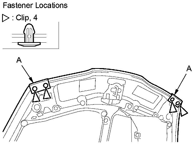 1. Detach the clips with a clip remover, then remove the hood seals (A). Take care not to scratch the hood.