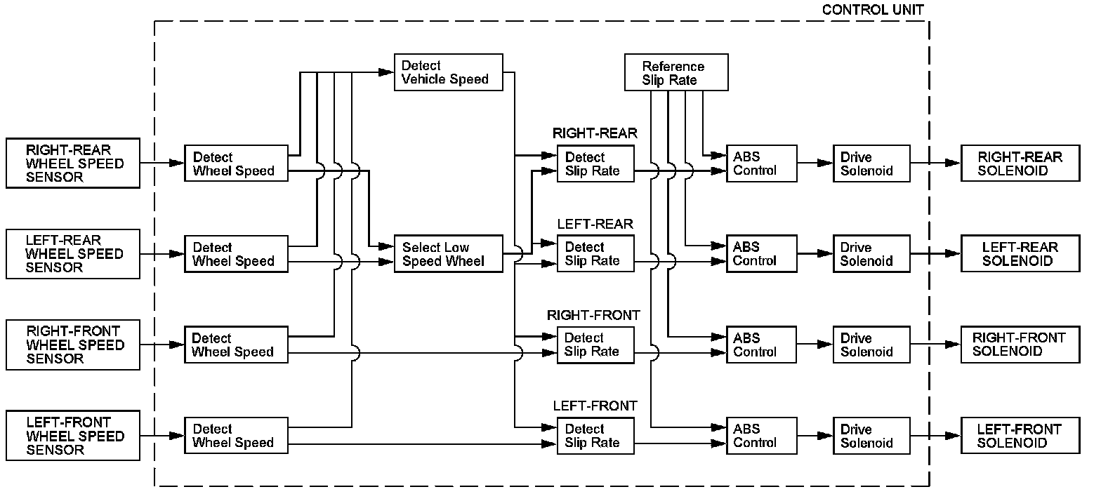 Without ABS, when the brake pedal is pressed while driving, the wheels sometimes lock before the vehicle comes to a stop. In such an event, the maneuverability of the vehicle is reduced if the front wheels are locked, and the stability of the vehicle is reduced if the rear wheels are locked, creating an extremely unstable condition. With ABS, the system precisely controls the slip rate of the wheels to ensure maximum grip force from the tires, and it thereby ensures maneuverability and stability of the vehicle. The ABS calculates the slip rate of the wheels based on the four wheel speeds, and then it controls the brake fluid pressure to reach the target slip rate.