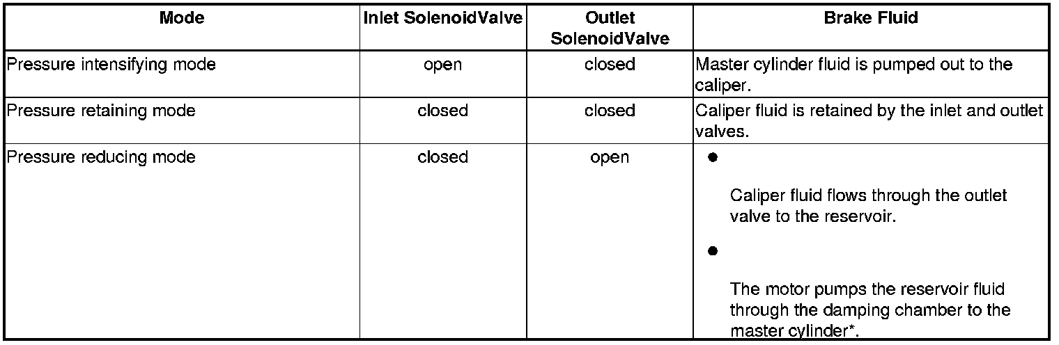 The ABS modulator consists of the inlet solenoid valve, the outlet solenoid valve, the reservoir, the pump, the pump motor, and the damping chamber. The modulator reduces the caliper fluid pressure directly. It is a circulating-type modulator because the brake fluid circulates through the caliper, the reservoir, and the master cylinder. The hydraulic control has three modes: pressure intensifying, pressure retaining, and pressure reducing. The hydraulic circuit is an independent four channel type, one channel for each wheel.