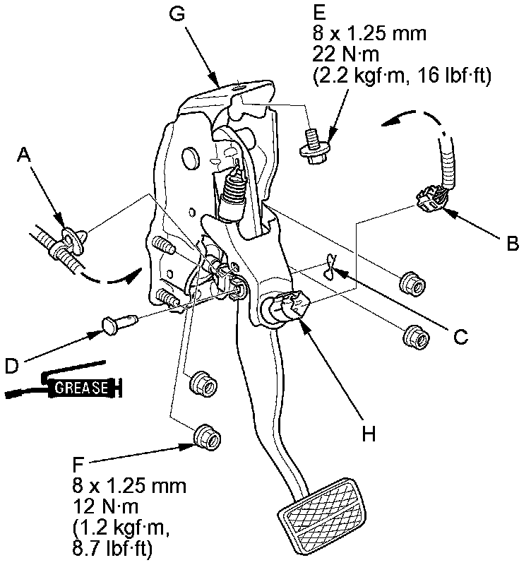7. Remove the brake pedal position switch (H) by turning it counter clockwise.