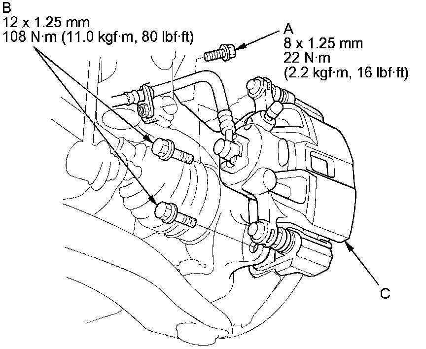 4. Remove the brake caliper bracket mounting bolts (B), then remove the caliper assembly (C) from the knuckle. To prevent damage to the caliper assembly or the brake hose, use a short piece of wire to hang the caliper assembly from the undercarriage. Do not twist the brake hose excessively.