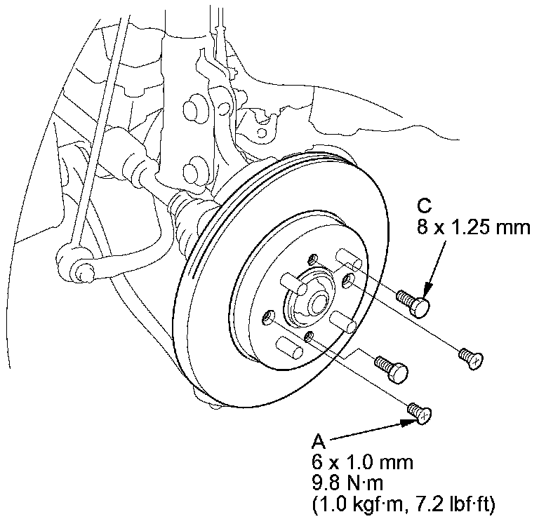 NOTE: If the brake disc is stuck to the front hub, thread two 8 x 1.25 mm bolts (C) into the brake disc to push it away from the front hub. Turn each bolt 90 degrees at a time to prevent the brake disc from binding.