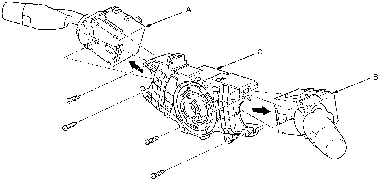 4. Remove the combination light switch (A) and the wiper/washer switch (B) from the combination switch body assembly (C).
