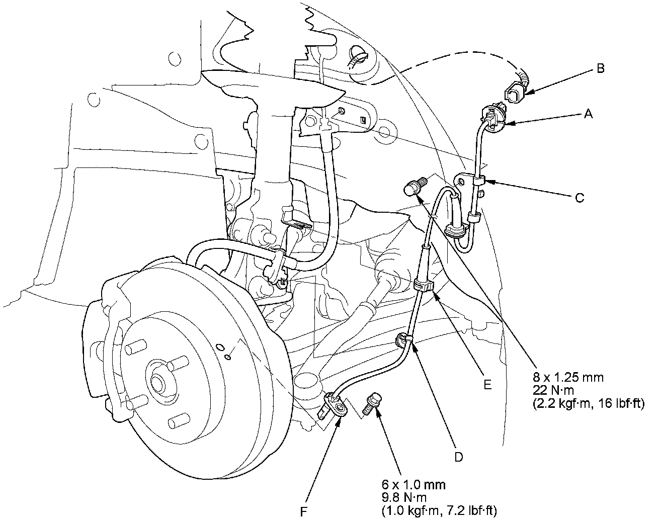 4. Remove the bolt and the wheel speed sensor (F).