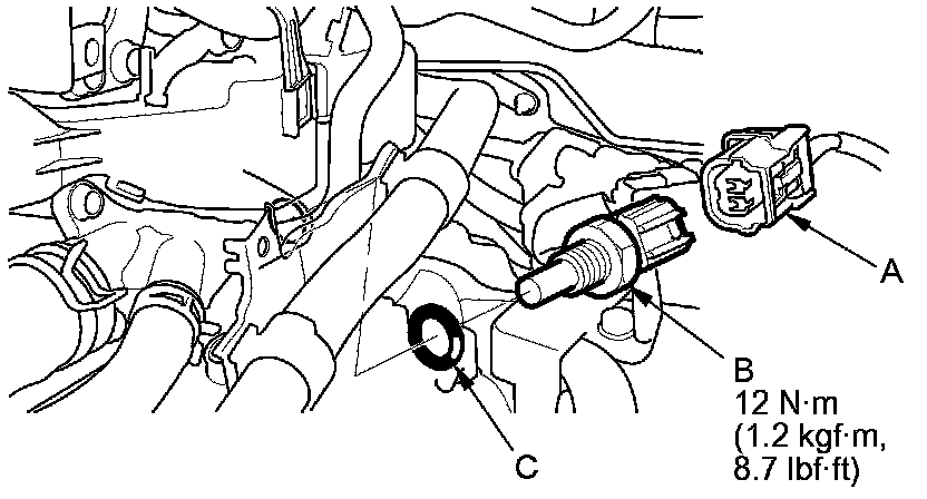 6. Install the parts in the reverse order of removal with a new O-ring (C), then refill the radiator with engine coolant Service and Repair.