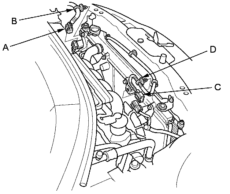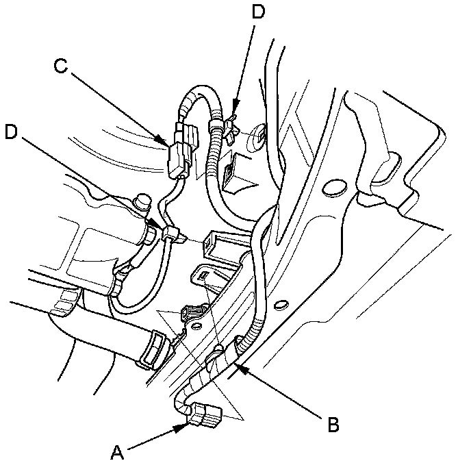 4. With A/C: Remove the A/C compressor clutch connector (C) from the clamp, then remove the harness clamps (D).