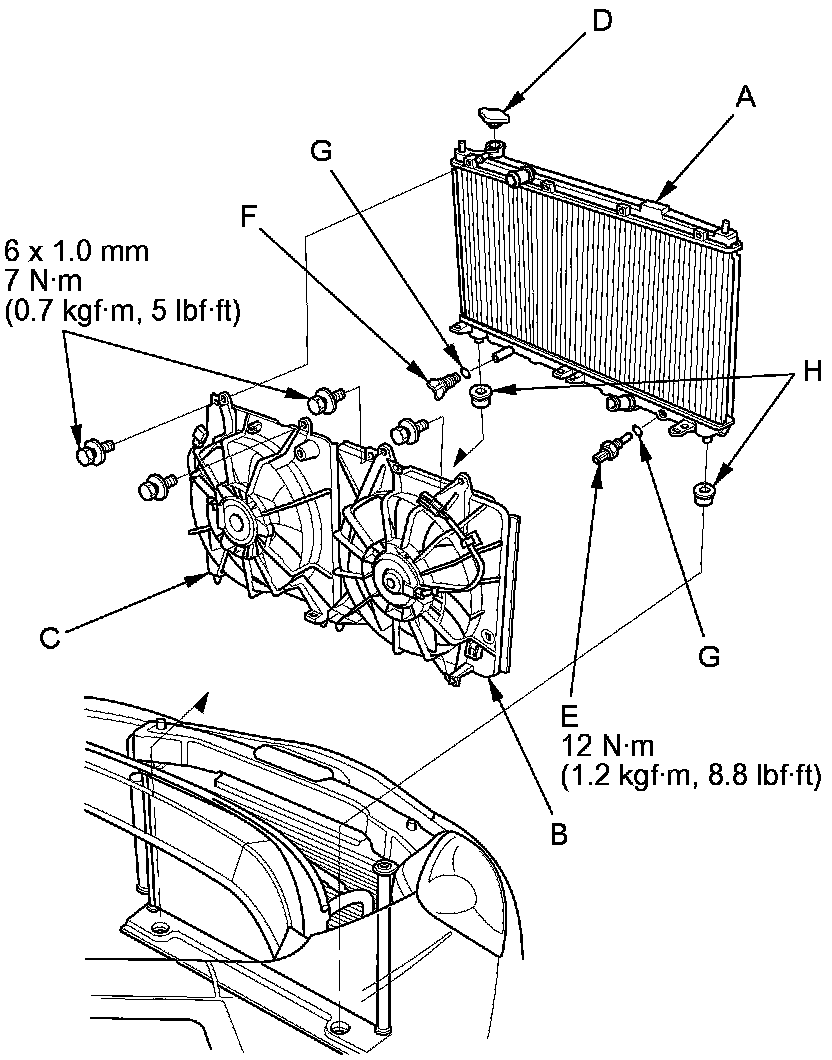 15. Remove the radiator fan shroud assembly (C), radiator cap (D), the ECT sensor 2 (E), and the drain plug (F).