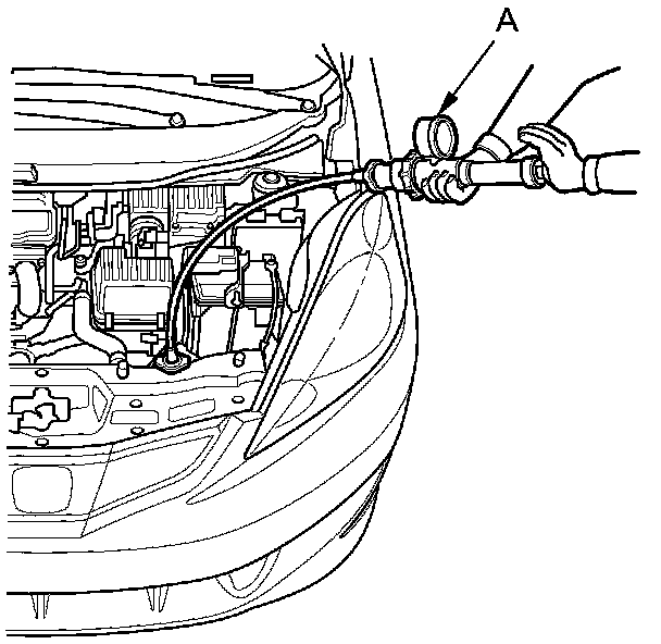 2. Attach a commercially available pressure tester (A) to the radiator, and apply a pressure of 93-123 kPa (0.95-1.25 kgf/cm2, 13.5-18 psi).