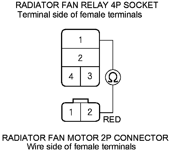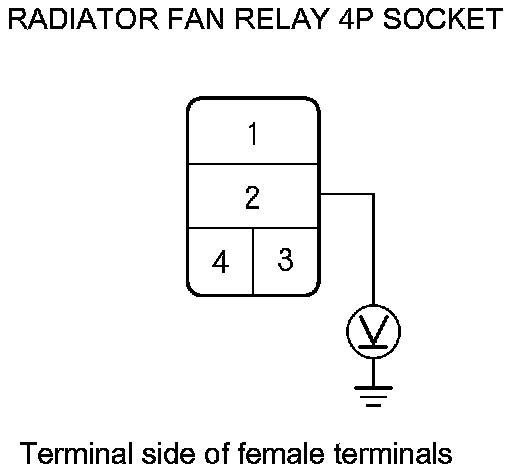 5. Check for continuity between the radiator fan relay 4P socket terminal No. 1 and the radiator fan motor 2P connector terminal No. 2.