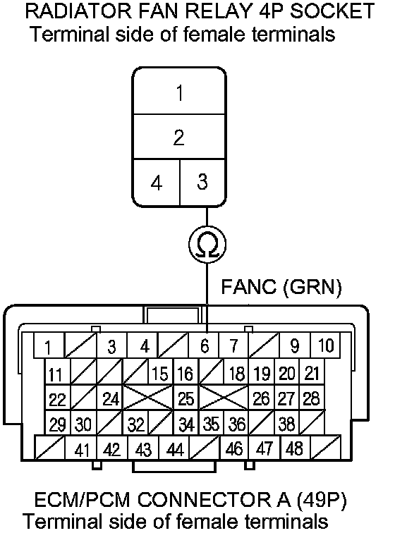 16. Check for continuity between the radiator fan relay 4P socket terminal No. 3 and ECM/PCM connector terminal A6.