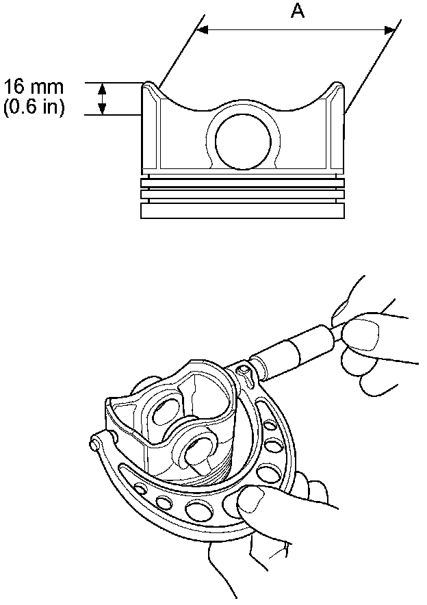 3. Measure the piston diameter (A) at a point 16 mm (0.6 in) from the bottom of the skirt.