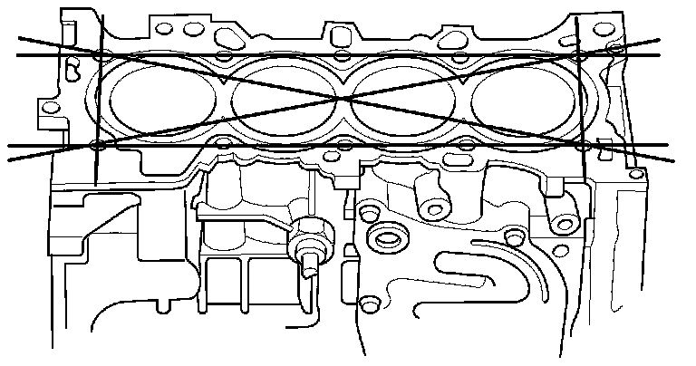 6. Check the top of the engine block for warpage. Measure along the edges and across the center as shown.