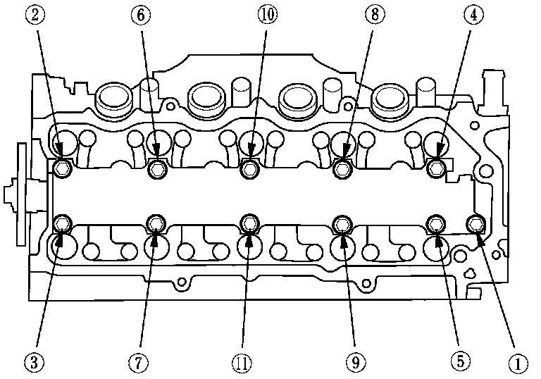 3. Unscrew the rocker shaft mounting bolts two turns at a time in the sequence shown.