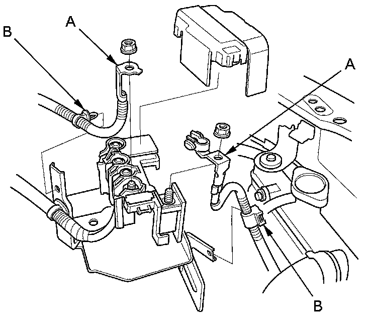 7. Remove the ground cable (A), then remove the transmission mount bracket (B).
