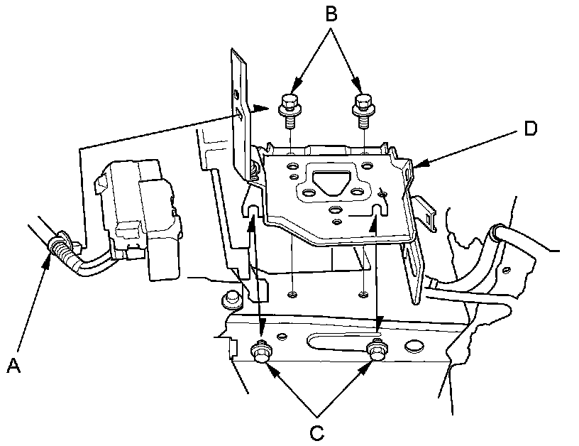 5. M/T model: Remove the harness clamp (A). Remove the two bolts (B) and loosen the two bolts (C), then remove the battery base (D).