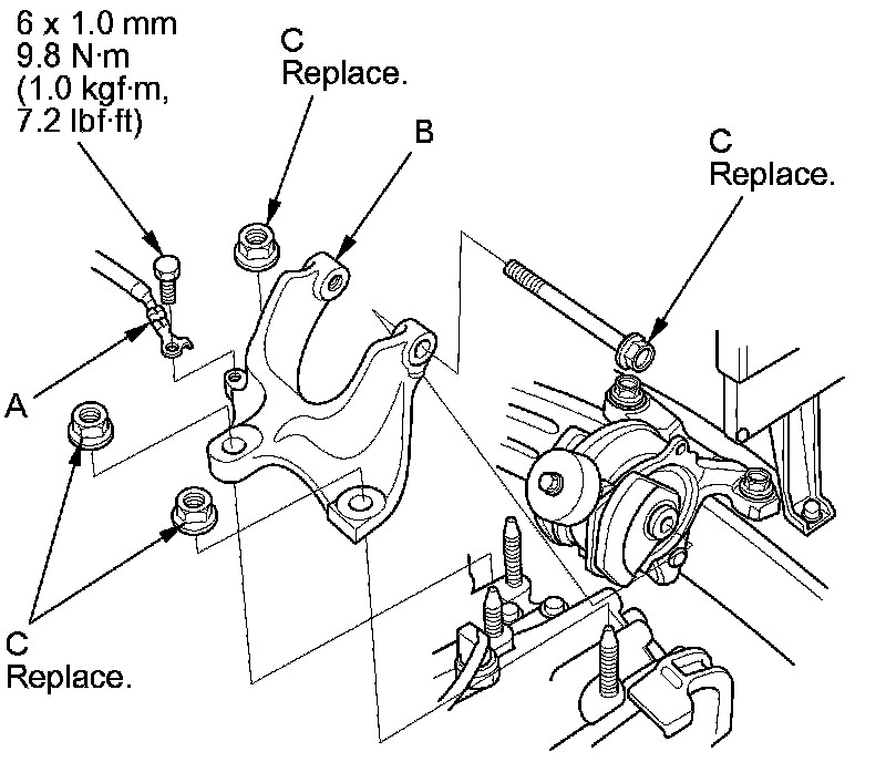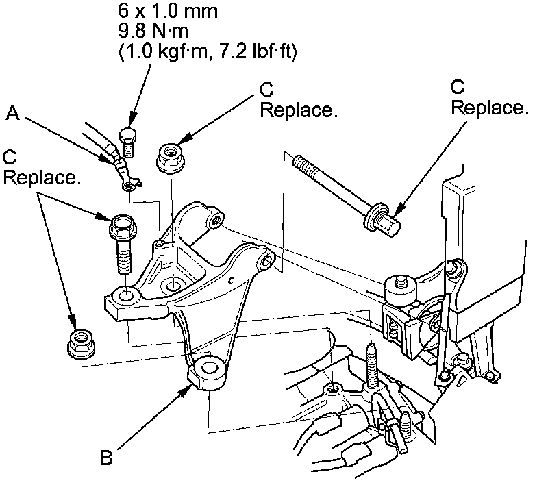 8. Install the transmission mount bracket, and loosely tighten the new transmission mount bracket mounting bolts and nuts (C).
