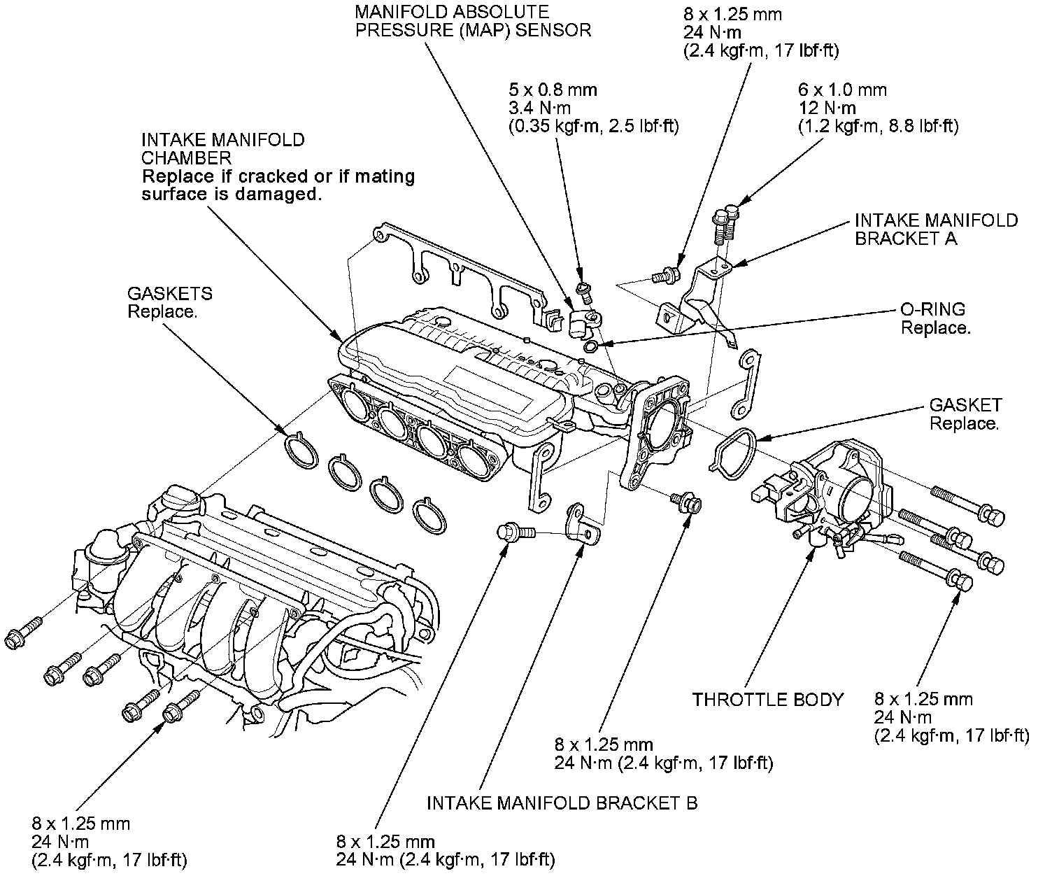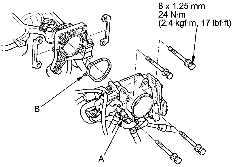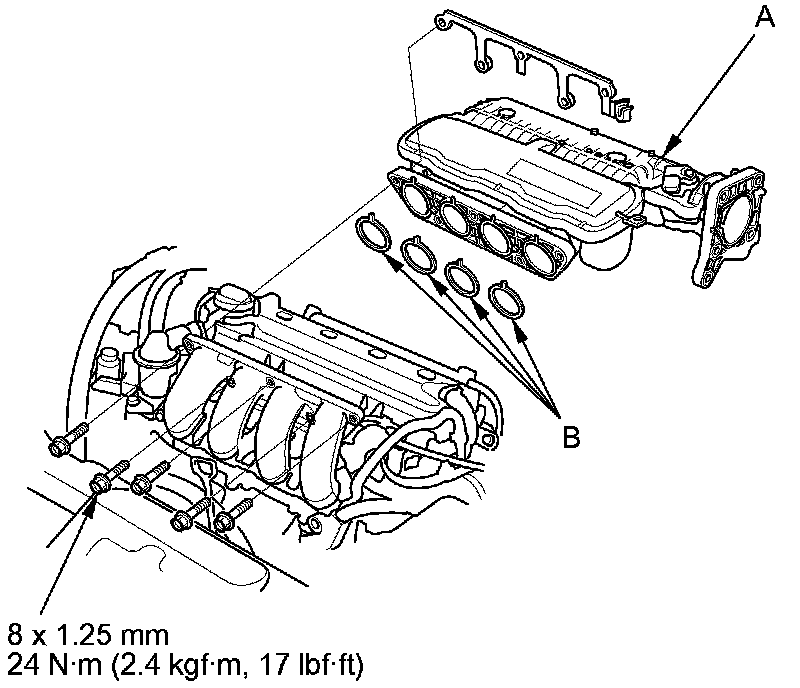 1. Install the intake manifold chamber (A) with new gaskets (B), and tighten the bolts in a crisscross pattern in three steps, beginning with the inner bolt.
