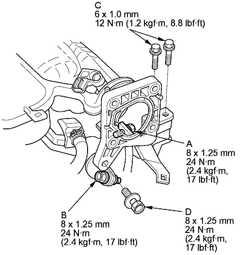 2. Loosen the intake manifold bracket mounting bolt (A), (B). Tighten the mounting bolts (C), then tighten the mounting bolt (A). Loosely tighten the mounting bolt (D), and tighten the mounting bolt (B), then tighten the mounting bolt (D).