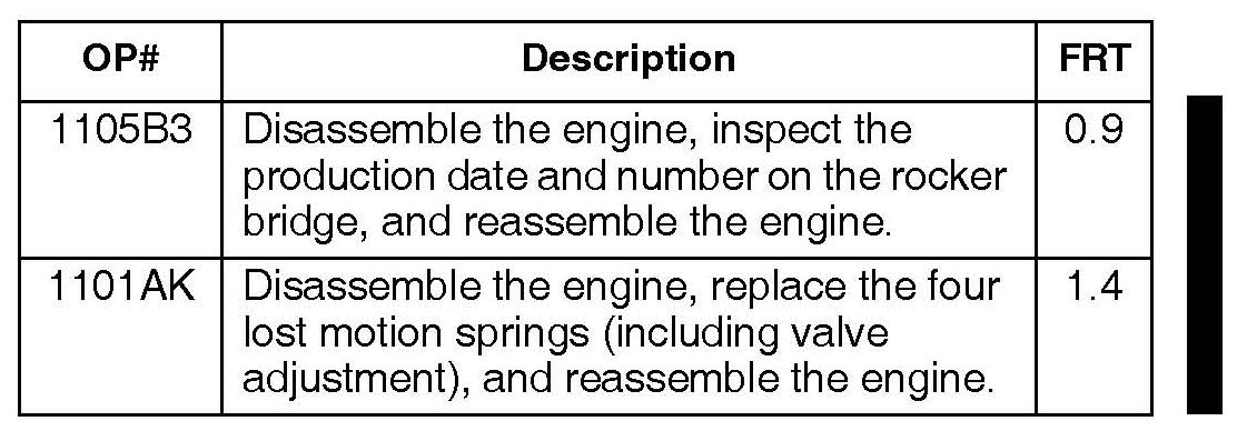 ^ If the rocker bridge date is 091120 (November 20, 2009), and the production number is 216 or higher, or the date is later than 091120, the lost motion springs are OK. Go to step 19 to reassemble the engine.