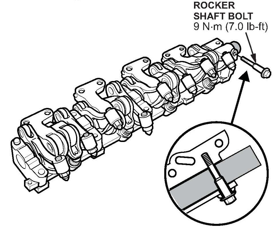 19. Install the rocker shaft bolt, and torque it to 9 N.m (7.0 lb-ft).