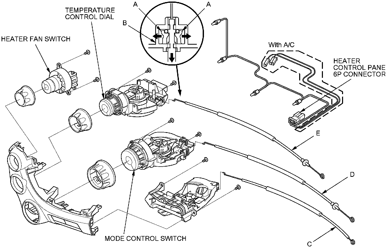 2. Spread the cable stops (A) in the cable holders (B) with snap ring pliers, then pull out the recirculation control cable (C), the mode control cable (D), and the air mix control cable (E).