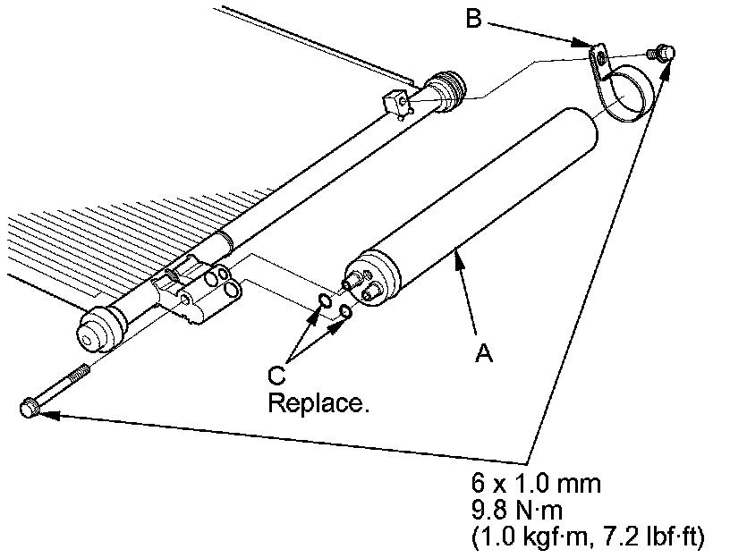 2. Remove the bolts from the A/C condenser, then remove the receiver/dryer (A), the bracket (B), and the O-rings (C).