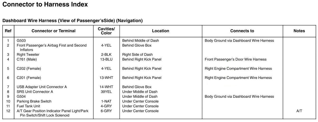 Dashboard Wire Harness (View Of Passenger's Side) Connector And Harness Locations (Navigation)