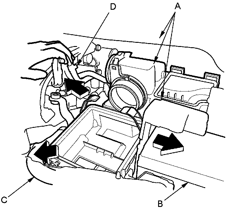 4. Remove the battery hold down, and reposition the battery (B). Reposition the radiator upper hose (C), and the breather pipe (D) as shown.