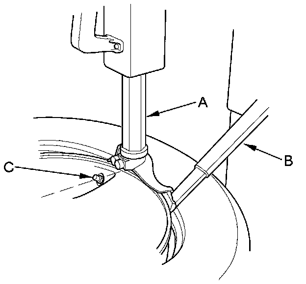 5. Position the wheel so the tire machine (A) and tire iron (B) are next to the valve stem (C) and will move away from it when the machine starts. Then remove the tire from the wheel.