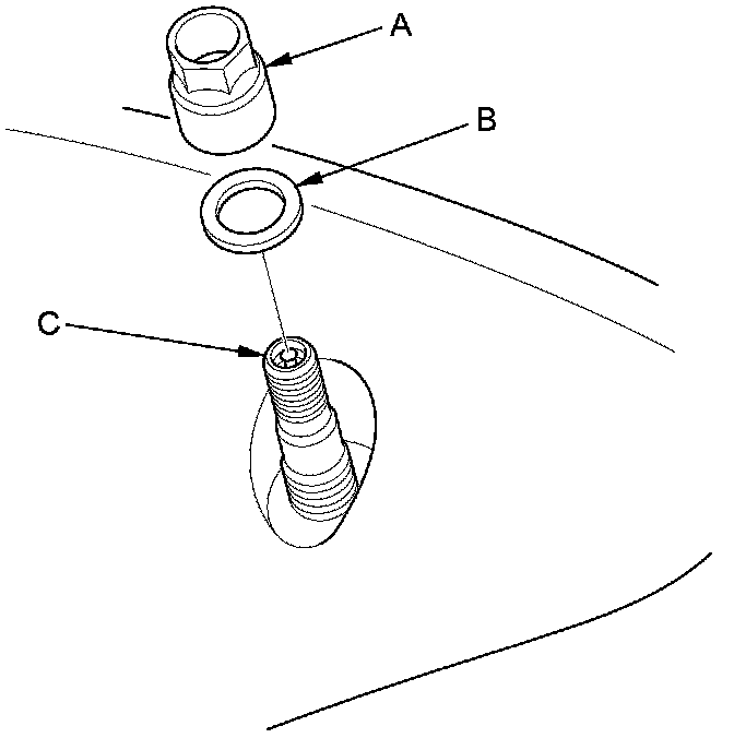 6. Remove the valve stem nut (A) and the washer (B), then remove the tire pressure sensor with the valve stem (C) from the wheel.