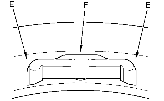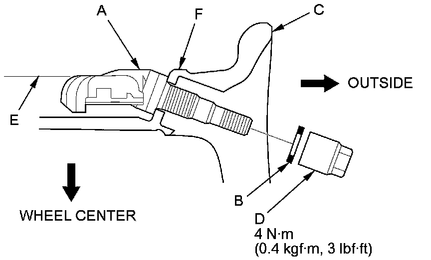 NOTE: Install the tire pressure sensor so that the sensor housing surface (E) does not extend beyond the protrusion (F) on the wheel to prevent the sensor housing from being caught on the bead of the tire when assembling the tire.