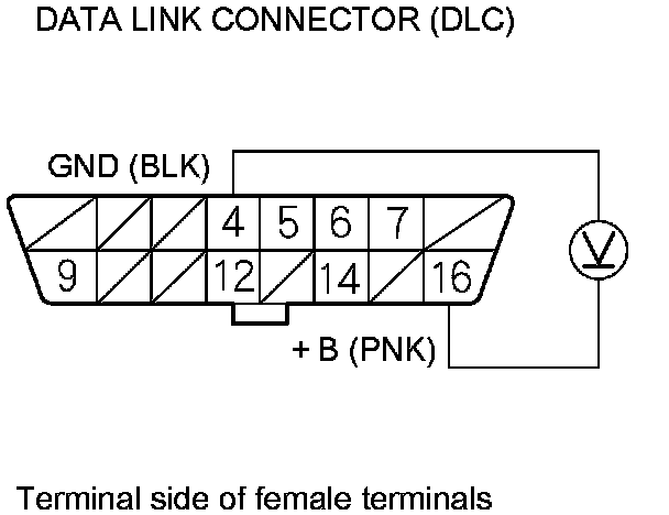 28. Measure the voltage between DLC terminal No. 16 and body ground.