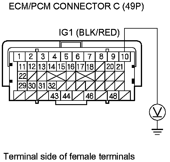 59. Measure the voltage between ECM/PCM connector terminal C10 and body ground.