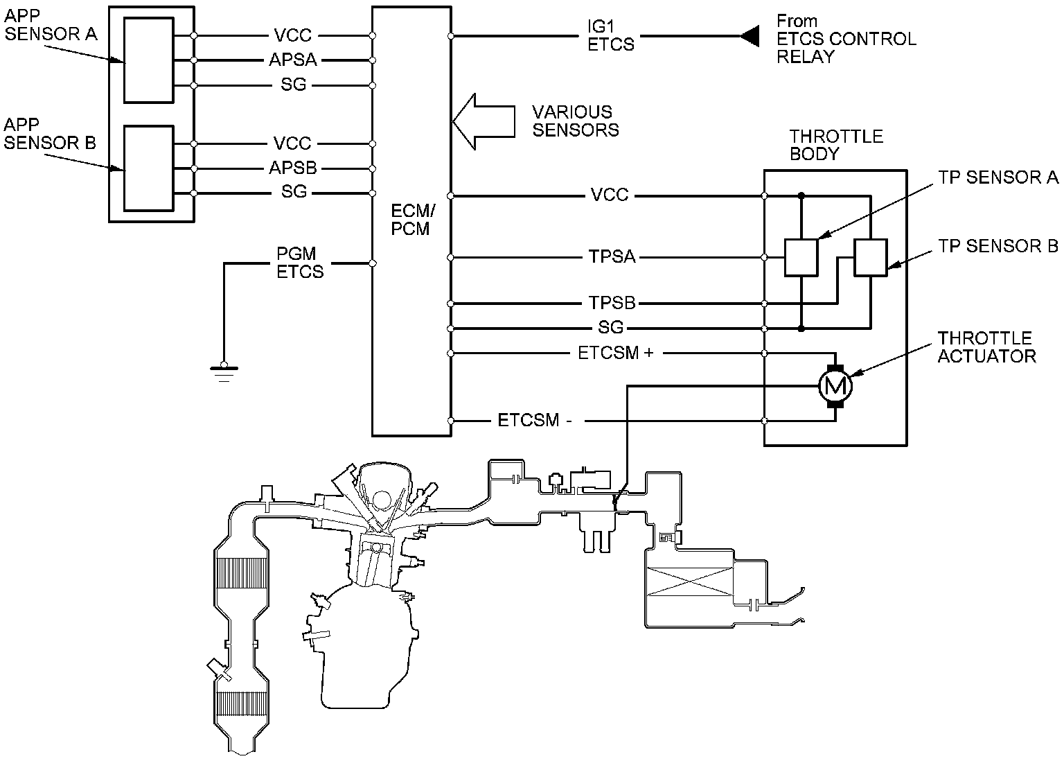 The electronic throttle control system consists of the throttle actuator, throttle position (TP) sensor A/B, accelerator pedal position (APP) sensor A/B, the electronic throttle control system (ETCS) control relay, and the ECM/PCM.