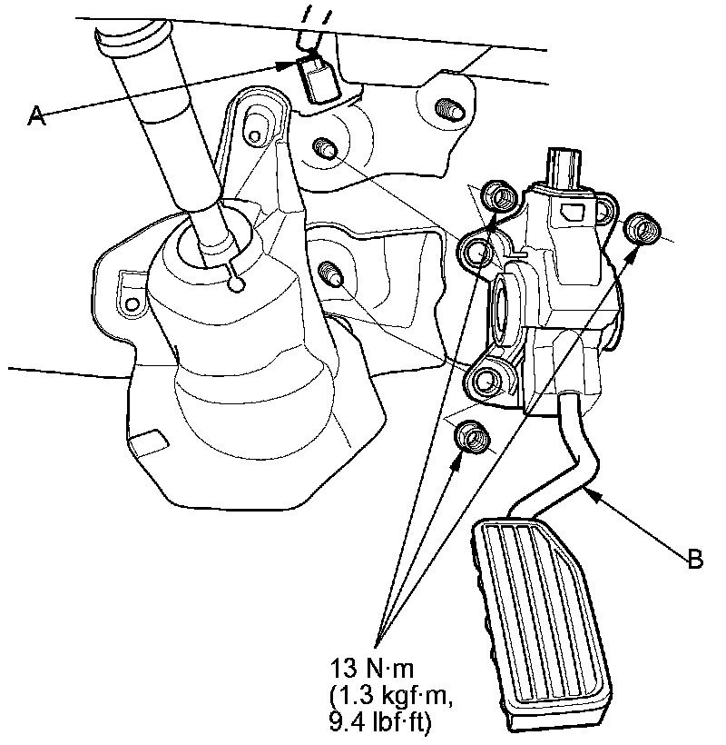 3. Remove the accelerator pedal module (B).
