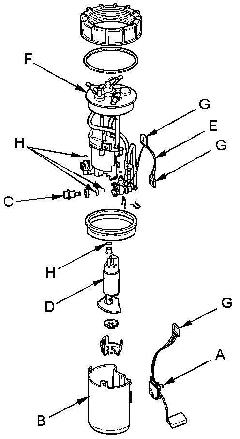 3. Remove the fuel pressure regulator (C), the fuel pump (D), and the wire harness (E) from the fuel filter set (F).