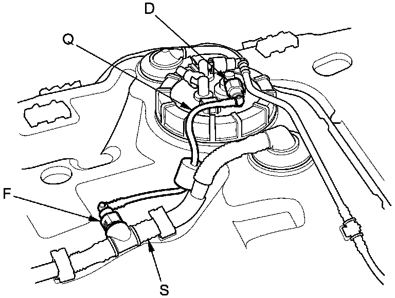 The fuel line/quick-connect fittings (A, B, C, D, E, F, G, H, I, J, and K) connect the fuel rail (L) to fuel feed hose (M), the fuel feed hose to the fuel line (N), the fuel feed line (O) to the fuel tank unit (P), the fuel tank unit to the fuel vent tube (Q), the fuel tank unit to the suction line (R), the fuel vent tube to the fuel tank vapor control valve hose (S), the suction tube to the fuel tank vapor recirculation tube (T), the suction tube to the breather pipe (U), the breather pipe to the non-return valve tube (V), and the fuel purge pipe (W) to the EVAP canister (X). When removing or installing the fuel feed hose, the fuel tank unit, the fuel tank, or the suction tube, or when disconnecting/connecting the quick-connect fittings, pay attention to the following: