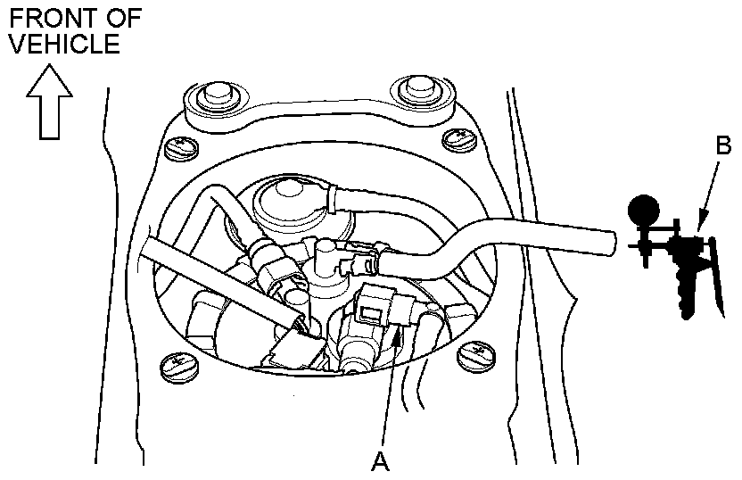 3. Disconnect the suction line (A) from the fuel tank unit, and connect a vacuum pump/gauge, 0-30 in Hg (B) to the hose as shown.